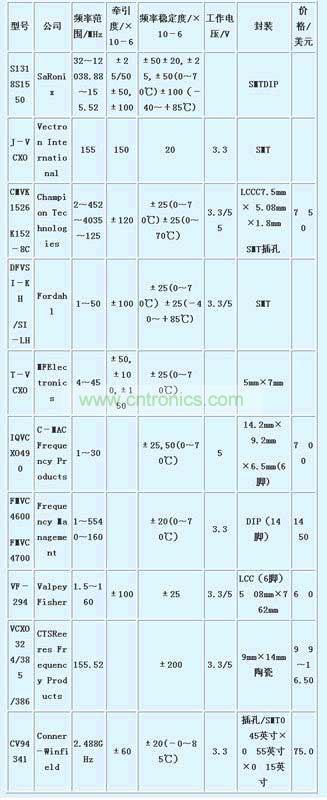 隨著現代無線通信系統向高頻、寬帶、便攜式方向發展,要求VCXO具有高頻、高性能、頻率范圍寬、線性度好、頻率穩定度優、頻率牽引誤差小、噪聲低和封裝尺寸小等特性。世界上各先進國家競相開發與生產高水平的產品來滿足日益增長的市場需求。表1為美國十大著名VCXO廠商生產的VCXO品種、性能和價格1。