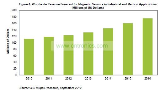 2011年工業(yè)與醫(yī)療磁性傳感器營業(yè)收入為1.182億美元,而2010年是1.119億美元。盡管該領(lǐng)域的營業(yè)收入少于汽車和無線-消費等其它磁性傳感器領(lǐng)域,但將促進(jìn)未來幾年傳感器市場持續(xù)擴(kuò)張。到2016年,這個磁性傳感器領(lǐng)域的營業(yè)收入將增至1.755億美元,如圖所示,五年復(fù)合年度增長率為8%。