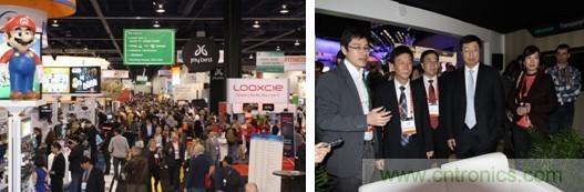 (圖為美國CES展會現場人氣火爆及深圳市平板顯示行業協會領導陪同工信部領導一行參觀)