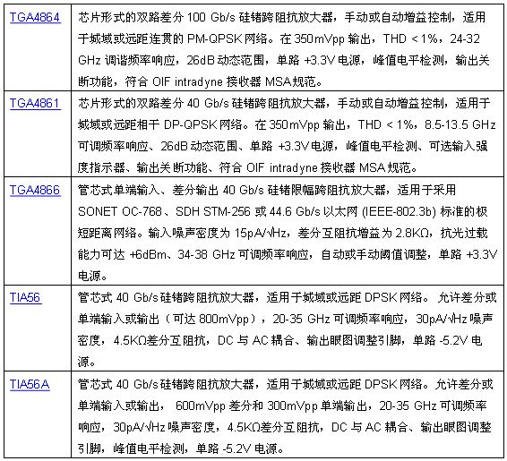TriQuint新的跨阻抗放大器TGA4864、TGA4861、TGA4866、TIA56和TIA56A提供了許多片上 (on-chip) 的優勢;現已供應樣品。
