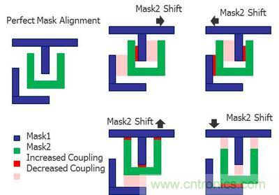圖2:雙重成像(DP)的光罩可能存在的未對準情況要求設計人員評估更多寄生參數提取的corners,以驗證集成電路的時間選擇和性能。