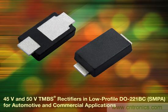 【導讀】Vishay日前推出新款45V和50V TMBS整流器,這些高電流密度的整流器適合汽車和商業應用,這些器件具有0.95mm薄外形、采用DO-221BC(SMPA)封裝、低壓降,在應用中可減少功率損耗,提高效率。