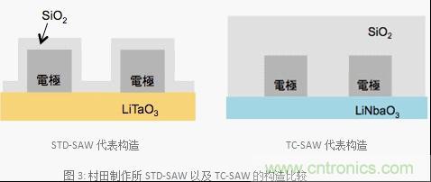 圖3是村田制作所STD-SAW以及TC-SAW構(gòu)造的示意圖。SAW雙工器的頻率溫度依賴(lài)性是由于使用了壓電電路板造成的。此外,STD-SAW、TC-SAW都是因?yàn)槭褂玫膲弘婋娐钒寰哂蓄l率溫度依賴(lài)性的相同特點(diǎn)。如圖3所示,TC-SAW最具代表性的特征之一是整塊電路板跟STD-SAW相比它的表面覆蓋了一層很厚的二氧化硅(SiO2)。壓電電路板的溫度上升的話(huà)頻率就會(huì)降低,那么頻率溫度系數(shù)就會(huì)變成負(fù)值。另外,SiO2具備正頻率溫度系數(shù)的特點(diǎn)。因此,和STD-SAW相比的話(huà)由于覆蓋了一層厚SiO2的獨(dú)特構(gòu)造,SiO2的正頻率溫度系數(shù)的影響會(huì)變大,那么SAW雙工器與STD-SAW相比就實(shí)現(xiàn)了抑制頻率溫度依賴(lài)性的特點(diǎn)。STD-SAW的保護(hù)膜SiO2具有強(qiáng)大的特質(zhì),如果覆蓋了像TC-SAW一樣厚的SiO2的話(huà)就不能保證帶寬,同時(shí)也不能獲得優(yōu)良的特性。因此,TC-SAW將電路板的材料從LiTaO3變成了LiNbaO3,才能夠確保必要的帶寬。此外,TC-SAW的LiNbaO3的切割角發(fā)生了變化使得頻率選擇性變得可控制,村田制作所運(yùn)用了對(duì)應(yīng)項(xiàng)目的必要特性設(shè)計(jì)了符合市場(chǎng)需求的最佳切割角。