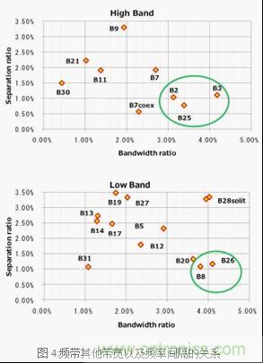 雙工器的設(shè)計(jì)根據(jù)Third Generation Partnership Project (3GPP)的規(guī)格根據(jù)頻帶的送信和收信帶寬以及送信端和收信端的頻率間隔(Separation ratio)決定了其難易度。一般來(lái)說(shuō)頻率的帶寬越廣那么送信端和收信端的頻率間隔越小難易度就越高??偨Y(jié)兩者的關(guān)系來(lái)看,如圖4。村田制作所正致力于圖4中圈出的部分,計(jì)劃優(yōu)先實(shí)現(xiàn)TC-SAW對(duì)應(yīng)的產(chǎn)品。