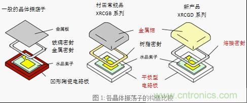 一般的晶體振蕩子采用的是凹形陶瓷電路板,本公司采用的是跟CERALOCK®相同的平板型電路板。因此提高了包裝內(nèi)部的空間利用率,與一般的晶體振蕩子相比能搭載更大的晶體元素。此外,由于金屬帽和電路板連接,常規(guī)產(chǎn)品采用的是樹脂封裝,XRCGD系列采用的是熔接封裝,通過密封構(gòu)造對(duì)應(yīng)了頻率的高精度化。(圖1)