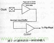 采用這種輸入電路后,由于常規(guī)I/O是三態(tài)的,因此用戶不必?fù)?dān)心時鐘進(jìn)入器件。當(dāng)然,增加一級門電路會產(chǎn)生0.6ns的較大時鐘延時,幸好這在多數(shù)低功率設(shè)計(jì)中是可以接受的。注意應(yīng)將與CLKINT緩沖器相關(guān)的CLKA或CLKB引腳接地。