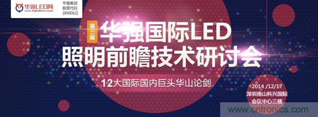 《第三屆華強國際LED照明前瞻技術研討會》將于2014年12月17日(周三)在廣東省深圳市科技園科興國際會議中心3樓舉行,屆時臺灣拓撲產業研究所所長楊勝帆、NXP市場營銷總監王永斌、Marvell技術市場經理關振源、明微電子副總經理李照華、昂寶副總裁高維、昂帕董事長桑鈞晟博士、英飛特電子副總經理張華建、華燦光電副總裁王江波、聚元微電子總經理韓興成、綠寶石技術總監伍松、中昊光電總經理王孟源、華燦光電副總裁王江波、清華大學副研究員錢可元將親自前來與您共同探討2015年LED照明市場的新需求、新變化和新趨勢,精彩就在眼前,期待您也能撥冗前來共襄這一LED照明行業全明星盛會。