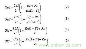 現(xiàn)在我們應(yīng)該把實際閾值點(δi, δs)和想要的閾值點(±T)區(qū)分開來,后者通常相當(dāng)于容差R加上一些安全余量。注意,為了簡化分析,我們假設(shè)想要的閾值點剛好相反。通過選擇增益開展模型調(diào)整,目的是使δi = (-T)和δs = T。基于這樣的考慮,模型增益見下面的公式(2)、(3)、(4)和(5)。在這些公式中,U、Ut1、Ut2和Rp的選擇對于最大限度地提高性能來說很關(guān)鍵。這個課題后面再討論。