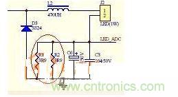 先看一個簡單的電路圖,圖1是通過采樣電阻R1和R2對流過LED燈的電流采樣,然后調(diào)整PWM輸出,以保證不同電壓下流過LED燈的電流恒定。