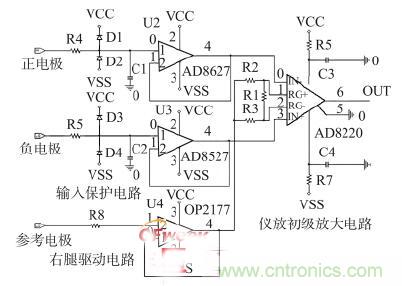 前置放大電路由前級放大電路、帶通濾波電路和50 Hz工頻陷波電路組成,其中,前級放大電路又包括輸入保護電路、右腿驅動電路和儀表運放放大電路組成,如圖2 所示。