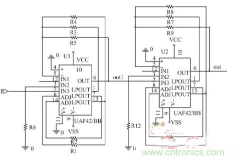 使用兩片UAF42 芯片構成4 階陷波器增加陷波深度,設計工頻陷波電路Q 值為50, 50 Hz 陷波深度為- 110 dB。相比于傳統的雙T 陷波器,此陷波器中心頻率在設計時就可設置好,免去了陷波中心頻率的調試。此外,只需要連接設計時計算好電阻值的電阻器即可,免去了電容器的選型和匹配。