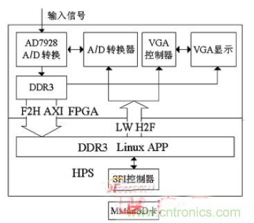 數字系統包括A/D 轉換模塊、VGA 顯示模塊、數據存儲模塊和算法處理模塊。SoC FPGA 中的HPS 和其它的硬件模塊可以通過Qsys 進行配置,用Quartus II 進行硬件設計,Qsys 和Quartus II 編譯可以產生軟件設計所需的信息文件。移植嵌入式Linux 系統,下載sof 文件,用DS—5 進行基于Linux 的系統軟件工程開發。