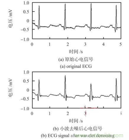 采用小波分析的方法進行心電信號去噪。小波分析由于能同時在時域和頻域中對信號進行分析,具有多分辨分析的功能,所以,在不同的分解層上有效地區分信號的突變部分和噪聲。對含有噪聲的原始心電信號進行小波分解后,噪聲部分主要集中在高頻小波系數中,包含有用信號的小波系數幅值較大,但數目少;而噪聲對應的小波系數幅值小,數目較多。基于上述特點,選取無偏似然估計閾值對小波系數進行處理,然后對信號重構即可達到消噪的目的。圖7 為心電信號小波去噪前后對比,信噪比可以達到121 dB。