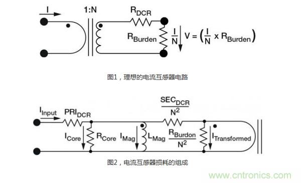 電流互感器(圖1)有三個突出優點:與線電壓隔離,無損測量電流,大信號電壓能很好地抵御噪聲。這種間接測量電流的方法要求用到變化的電流,例如交流電,瞬變電流或開關式直流電,來產生一個磁耦合到次級繞組里的變化磁場。次級測量電壓可以根據在初級和次級繞組間的匝數比實現縮放。這種測量方法被認為是“無損的”,因為電路電流通過銅繞組時的電阻損耗非常小。但是,如圖2所示,由于負載電阻、芯損,以及初級和次級直流電阻的存在,互感器的損耗會導致失去一小部分能量。