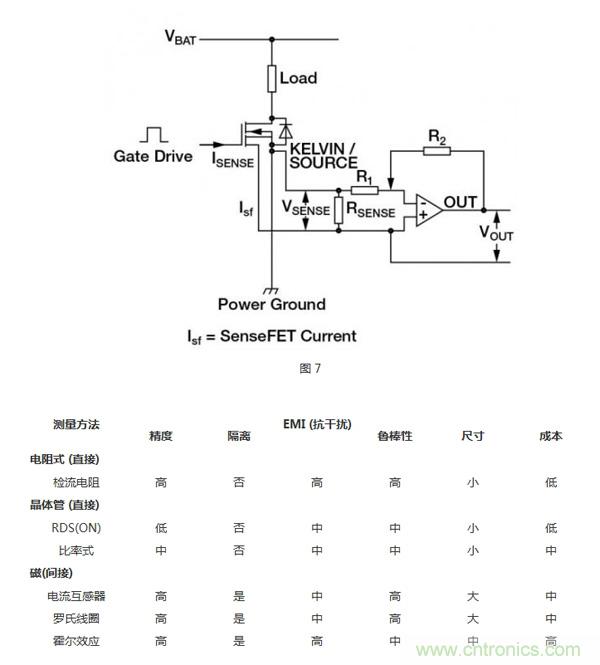 MOSFET由成千上萬個能降低導通電阻的并聯的晶體管元胞構成。檢流MOSFET使用一少部分并聯元胞,連到共柵極和漏極,但源極是分開的(圖7)。這樣就產生了第2個隔離的晶體管,即“檢測”晶體管。當晶體管導通時,流經檢測晶體管的電流與流經其他元胞的主電流成一定比例。