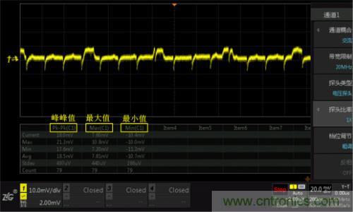 紋波測試一般以峰峰值來表示,具體可以使用【measure】進行自動測量,如下截圖ZDS2000系列示波器,能支持51種真正意義的參數測量統計功能,基于全存儲深度的基礎上測量紋波的參數,或者也可以使用“一鍵光標”進行手動測量,如下圖6所示。