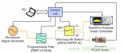 在圖1中,微波信號發(fā)生器所產生的信號經過一個可編程的帶通濾波器到達一個SPDT微波開關的輸入端(RF1),開關的二個輸出端J1和J2分別接需要被校準的頻譜分析儀和標準功率計。在校準測試過程中,功率計讀一次來自信號源的幅度后,開關即刻切換到頻譜分析儀,并記錄頻譜分析儀針對信號源幅度的讀數(shù)。