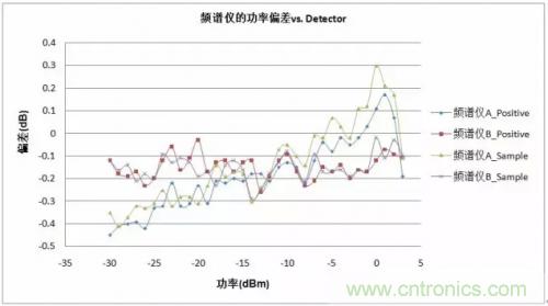 在測試過程中,每個參數(shù)的變化均以功率計為參照值,頻譜分析儀與功率計讀數(shù)的差值即為頻譜分析儀的精度偏差。