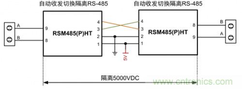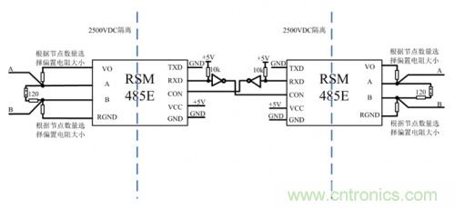 RS485的應用中,有時需對信號進行增強,或不同的RS485網絡之間進行電氣隔離,輸入和輸出都是RS485信號,此時需用到RS485的中繼器。而基于RSM485系列,可快速搭建簡易的隔離型RS485中繼器,如圖2 和圖3所示。