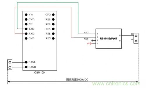 RS485和CAN雖然物理層都是差分傳輸,但因CAN多了更多的底層協議,兩者不能通過簡單的方式直接轉換。此時,使用如圖6所示的CSM100+RSM485模塊方式,利用CSM100能將CAN轉成UART數據,再用RSM485PHT將UART轉成RS485電平,實現RS485轉CAN的功能。