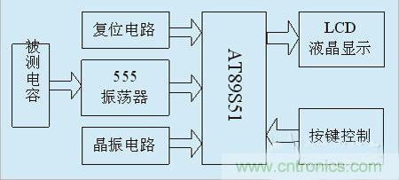 一般元件參數的數字化測量是把被測參數轉換成頻率后再進行測量,本設計采用555為核心的振蕩電路,將被測電容值轉化為頻率,并利用AT89S51處理器測量出頻率,再通過該頻率值計算出電容參數值。