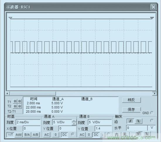 由上式可知,當電路設計完成后,振蕩器輸出f隨CX的變化而改變。改變R1、R2的值即可改變系統量程。系統量程分為四檔:(1)R1+2R2=470KΩ時,測1.0nF-10.0nF的電容值。(2)R1+2R2=47KΩ時,測10.0nF~100.0nF的電容(3)R1+2R2=4.7KΩ時,測100.0nF~1000.0nF的電容。(4)R1+2R2=470Ω時,測1.0μF~10.0μF的電容。圖3為R1+2R2=470KΩ時,測量電容為2μF振蕩輸出輸出波形。