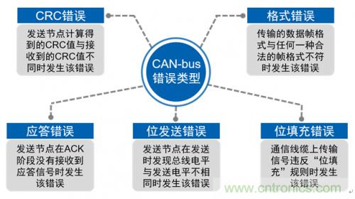 CAN-bus的可靠性很高,但是在某些情況下還是發(fā)生錯誤,為了使數據能夠在總線上可靠傳輸,CAN-bus規(guī)范對各類幀的格式、用途及發(fā)送時機都進行了詳細的規(guī)定。下面我們來總結下在CAN通訊中會出現哪些錯誤。