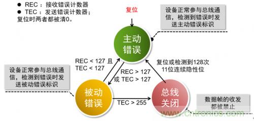 為了避免某個設備因為自身原因(例如硬件損壞)導致無法正常收發(fā)數據而不斷地破壞數據幀,從而影響其他正常節(jié)點通訊,CAN-bus規(guī)范中規(guī)定每個CAN控制器都有一個發(fā)送錯誤計數器和一個接收計數器。根據計數值不同CAN節(jié)點會處于不同的設備狀態(tài),狀態(tài)之間的轉換關系見下圖: