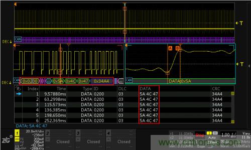 直接將波形數據解碼后以十六進制、十進制或字符的形式呈現出來,省去了工程師轉換的過程,大大加快了開發效率。如圖3為一段CAN協議的解碼,可以一步到位。