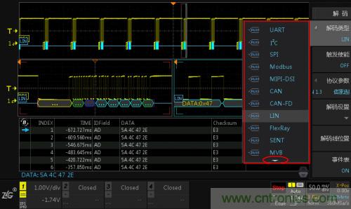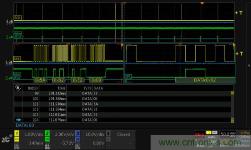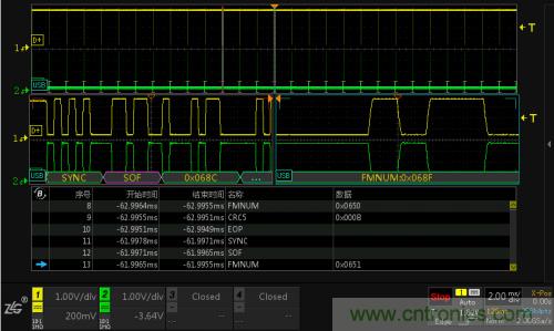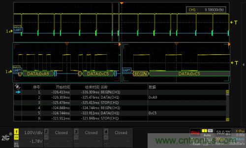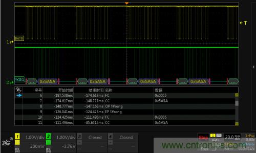ZDS4000系列示波器免費標配以上30余種協議解碼,支持解碼以“十進制”,“十六進制”,“字符”三種方式顯示,如圖9、10所示。