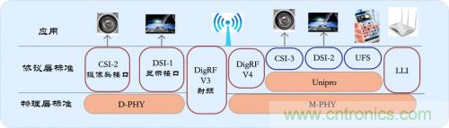 MIPI聯盟有不同的工作組,分別定義一系列的手機內部接口標準,如攝像頭接口CSI、顯示接口DSI、射頻接口DigRF等。統一接口標準的好處是手機廠商可以根據需要從市面上靈活選擇不同的芯片和模組,方便快捷的進行外觀和功能的設計。
