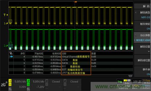 (2)ZDS4054 Plus標配512Mpts的存儲深度,且可對全內存數據進行解碼,MIPI-DSI協議解碼界面如圖8所示。可通過事件表查看具體的解碼內容,也可以將事件表中的內容通過導出報表的格式將其導出。