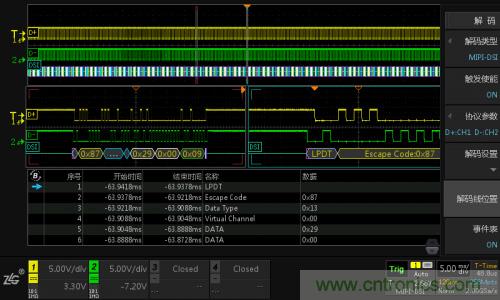 (1)現場模擬MIPI-DSI協議,使用數據挖掘型示波器ZDS4054 Plus,其免費標配MIPI-DSI協議低速LP模式解碼功能,具體操作如下圖7所示。