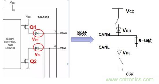 總線顯性時(邏輯為0),收發器內部Q1、Q2導通,CANH、CANL之間產生壓差;隱性時(邏輯為1),Q1、Q2截止,CANH、CANL處于無源狀態,壓差為0。
