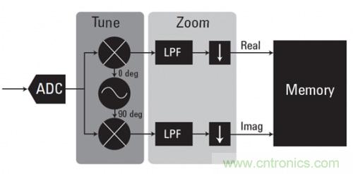 數(shù)字化儀采用諸如零抑制(zero suppress)等數(shù)據(jù)壓縮技術,只保留超過給定閾值的相關信號。它們還使用數(shù)據(jù)打包和四舍五入來優(yōu)化可用存儲器空間。也使用諸如數(shù)字下變頻(DDC)等實時數(shù)據(jù)壓縮技術。DDC 直接在 ADC 數(shù)據(jù)上進行數(shù)據(jù)的頻率轉換和抽取。圖 3 中的框圖顯示了其基本原理。捕獲到復雜的 IQ 數(shù)據(jù),可以使中心頻率下變頻到 0 Hz。然后使用濾波和數(shù)據(jù)抽取來去除不需要的頻率分量,縮減所需數(shù)據(jù)的大小。在對寬帶采集中的一小段頻譜進行分析時,DDC 非常有價值。DDC 不僅可以減少所需的存儲空間,而且可以降低寬帶綜合噪聲,改善整體信噪比(SNR)。