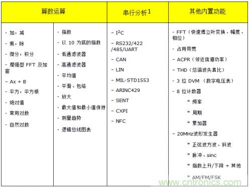 ·測量和分析。示波器針對易用性和測量速度進行了優(yōu)化。它們的硬件中內(nèi)置了各種測量和分析工具。如果是臺式示波器,用戶可以從臺式儀器的前面板訪問這些測量和工具,如果是模塊化儀器,用戶可以從軟件前面板訪問。這使得示波器非常適合用于在設計或故障診斷期間進行的各種常見測試。由于測量在硬件中執(zhí)行,因此可以快速獲取結果,縮短測試臺或 ATE 環(huán)境的測量時間。以下所示為 InfiniiVision 系列示波器中提供的一些算數(shù)運算、FFT 和串行協(xié)議分析工具。