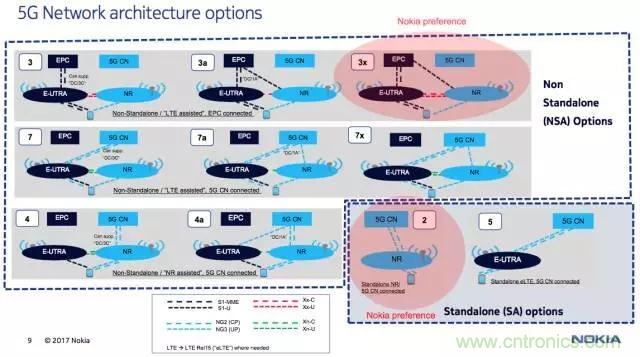 對于5G組網,3GPP在去年釜山會議上由德國電信提出了12種組網選項。其中選項3/3a/3x、7/7a/7x、4/4a為非獨立組網構架,選項2、5為獨立組網構架。