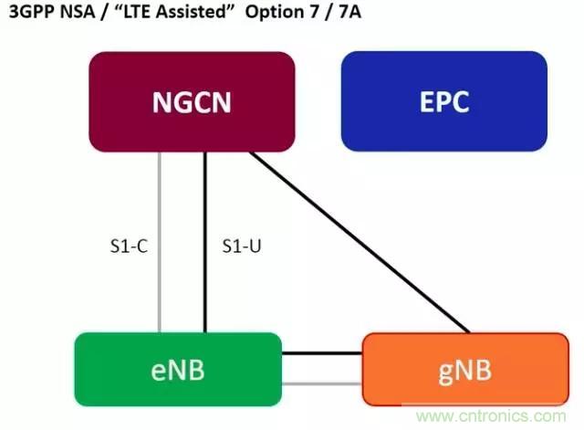 這次凍結的3GPP R15 NSA(5G NR非獨立組網)核心標準部分內容:,即沿用4G核心網(EPC),以4G作為控制面的錨點,采用LTE 與 5G NR雙連接的方式,利用現有的LTE網絡部署5G,以滿足領先運營商快速實現5G覆蓋的需求。