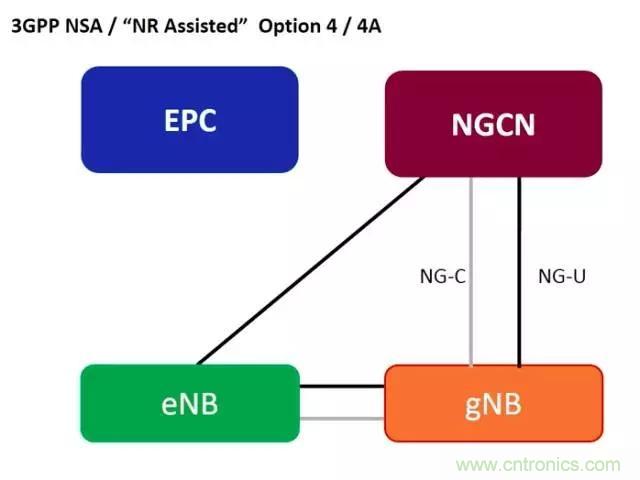 2)4G基站(eNB)和5G基站(gNB)共用5G核心網(NGCN),eNB仍然為主站,gNB為從站,控制面信令走4G基站至5G核心網。