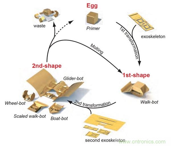 MIT開發透過磁鐵遠程控制的Primer機器人,其以長方形塑料片制造的外骨骼能自行折疊成不同的形狀,為各種不同的任務客制機器人;而當Primer完成工作后,則浸入水中溶解外骨骼…