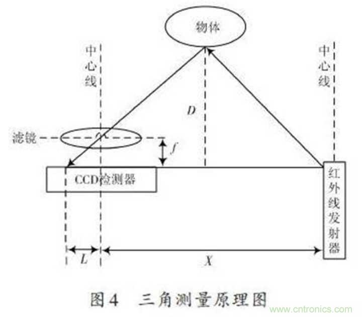 紅外感應器包含紅外發射器與CCD檢測器,紅外線發射器會發射紅外線,紅外線在物體上會發生反射,反射的光線被CCD檢測器接收之后,由于物體的距離D不同,反射角度也會不同,不同的反射角度會產生不同的偏移值L,知道了這些數據再經過計算,就能得出物體的距離了,如下圖所示。