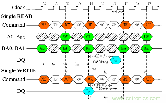 圖中,頻率時間(tCK)是從此次頻率邊緣至下次頻率邊緣為止的時間。列地址選通預(yù)充電時間(tRP)是從PRE命令至ACT命令為止的時間。列地址選通至行地址選通延遲(tRCD)是從ACT命令至RD命令或WR命令為止的時間。行地址選通潛伏(CL)是從RD命令開始等候一段時間,并且以tCK為基本單位,然后乘上倍數(shù)。寫入時間(tWR)是從WR命令至PRE命令為止的時間;另外還可以tCK為基本單位,然后乘上倍數(shù),如同行地址選通潛伏的計時方法,因此命名為行地址選通寫入潛伏(CWL)。列地址選通時間(tRAS)是從ACT命令至PRE命令為止的時間。更新命令時期(tRC)是從這次ACT命令至下次ACT命令為止的時間。