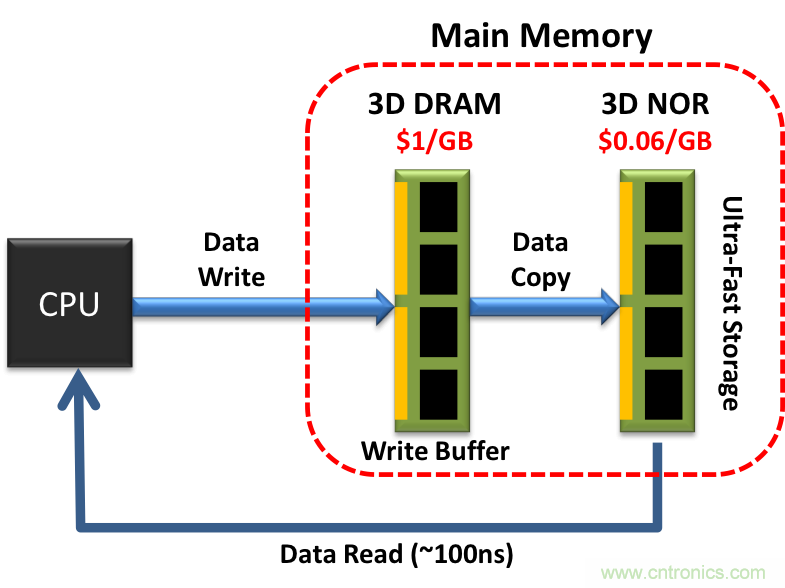 另一項建議是采用DDR4 NVDIMM,以取代DRAM作為主存儲器。非揮發性雙列直插式存儲器模塊(NVDIMM)有很多種類型;相較于其他以儲存為導向的NVDIMM,DDR4 NVDIMM能夠表現得和DRAM一樣快,而且可以作為主存儲器。幾年前,英特爾的3D XPoint看好DDR4 NVDIMM作為切入點,因為3D XPoint擁有NOR型閃存讀取延遲低(低于100ns)的優點,因而能像DRAM一樣快速運作。它也不需要預測軟件,因而能夠始終保持高性能。此外,采用單層儲存(SLC)的SLC NOR閃存具有很高的耐久性。因此,DDR4 NVDIMM的NOR閃存能夠取代DRAM,并以大量的主存儲器大幅提升系統性能,如圖3所示。