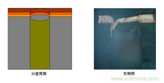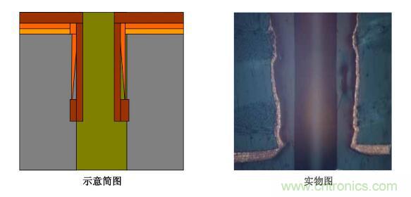 5.圖電孔無銅:斷口處圖電層未將板電層包住―――圖電層與板電層厚度均勻,斷口處齊斷;圖電層呈拉尖趨勢直至消失,板電層超過圖電層繼續(xù)延伸一段距離再行斷開。