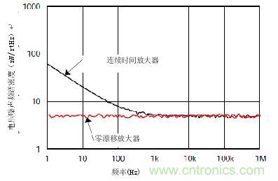 圖5顯示了零漂移(紅色)和連續時間(黑色)放大器的1/f和寬帶電壓噪聲頻譜密度。注意零漂移曲線沒有1/f電壓噪聲。