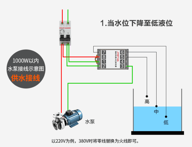 供水接線需要用到液位繼電器的2和3這組常開點,當水位下降到探頭低時,2和3就會導通水泵開始抽水。當水位達到探頭高時,2和3復位斷開電機停止,所以可以把2和3理解為一組開關。