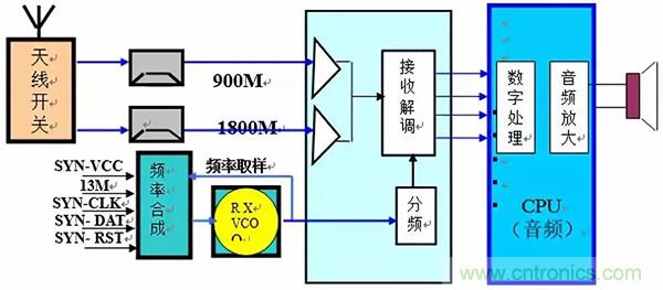 作用:a)、對(duì)天線感應(yīng)到微弱電流進(jìn)行放大,滿足后級(jí)電路對(duì)信號(hào)幅度的需求。b)、完成900M/1800M接收信號(hào)切換。