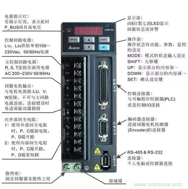 伺服驅動器主要有控制回路電源、主控制回路電源、伺服輸出電源、控制器輸入CN1、編碼器接口CN2、連接起CN3。控制回路電源是單相AC電源,輸入電源可單相、三相,但是必須是220v,就是說三相輸入時,咱們的三相電源必須經過變壓器變壓才能接,對于功率較小的驅動器,可單相直接驅動,單相接法必須接R、S端子。伺服電機輸出U、V、W切記千萬不能與主電路電源連接,有可能燒毀驅動器。CN1端口主要用于上位機控制器的連接,提供輸入、輸出、編碼器ABZ三相輸出、各種監控信號的模擬量輸出。