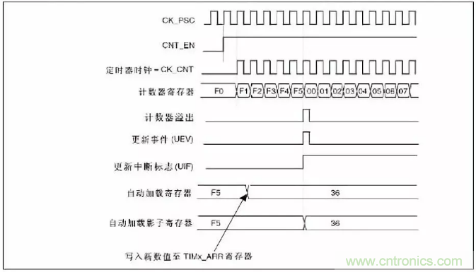 實際起作用的是影子寄存器,而程序員操縱的則是自動裝載寄存器。如果APPE位使能,表明自動裝載寄存器的值在下一次更新事件發生后才寫入新值。