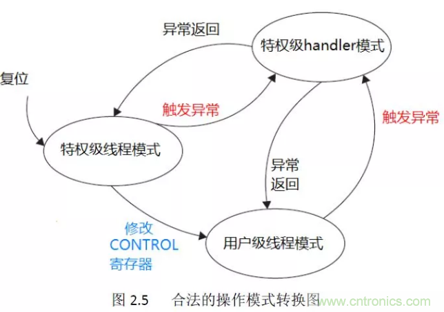 處理器也有兩種特權分級:特權級和用戶級。 這張圖說明了一切:復位進入特權級線程模式,如果有異常,進入特權級的handler模式處理異常或中斷例程,然后返回至特權級線程模式。通過修改CONTROL寄存器可以進入用戶級線程模式。